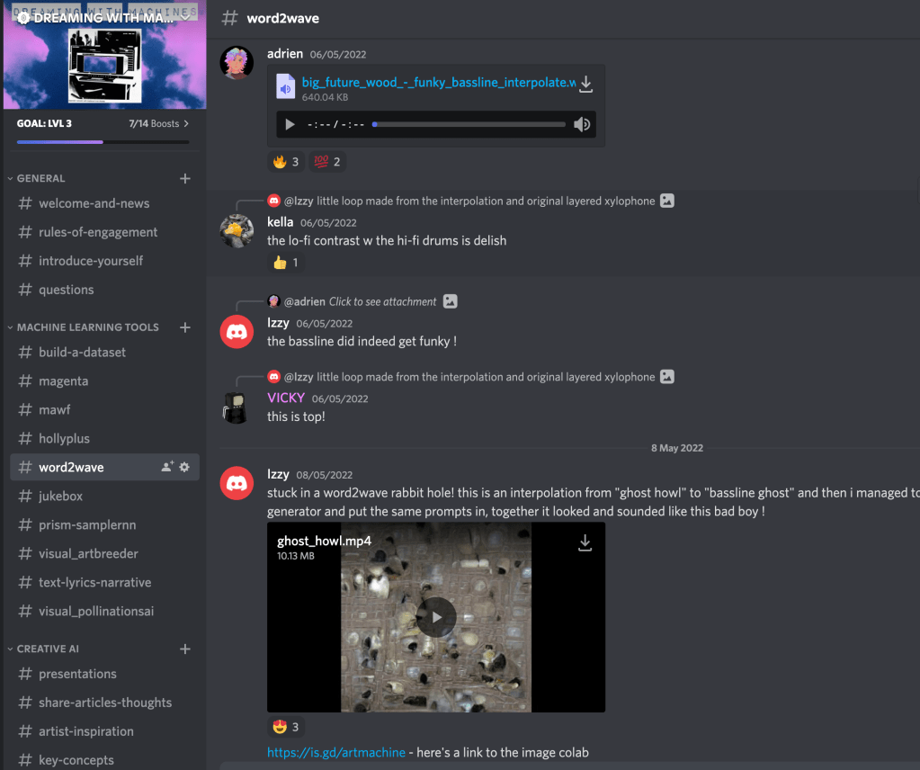 After theory and model introductions (pattern generation, timbre transfer and neural synthesis) it was time to get practical. We focused on how to construct a sonic dataset for training a model, with each participant thinking of a rationale for their material. How might they test the machine, what can we predict? We had some fascinating aural concepts to explore including dead technology in the future, elemental sonics and ritualistic waves. We used a range of google colab notebooks to generate sounds including Word2wave, Jukebox, PRiSMSampleRNN and plugins including MAWF and Magenta.